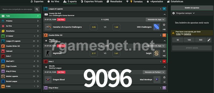O 9096 oferece uma grande seleção de opções de apostas em e-sports com probabilidades competitivas